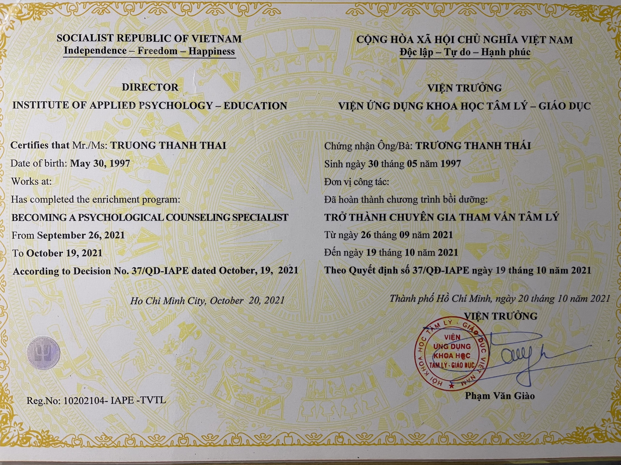 Đã hoàn thành chương trình bồi dưỡng: TRỞ THÀNH CHUYÊN GIA THAM VẤN TÂM LÝ
