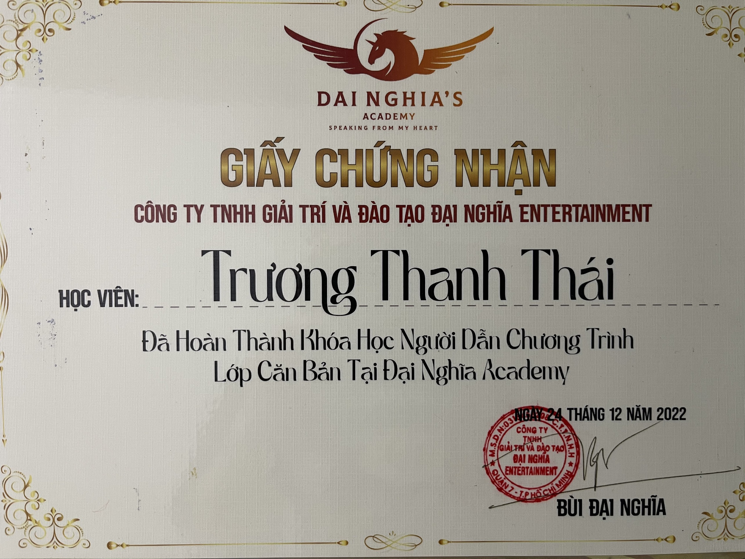 Đã Hoàn Thành Khóa Học: MC SỰ KIỆN CHUYÊN NGHIỆP Tốt Nghiệp; ĐẠO DIỄN SÂN KHẤU, TRƯỜNG CAO ĐẲNG VĂN HÓA, NGHỆ THUẬT TP. HỒ CHÍ MINH Tốt nghiệp chương trình đào tạo: PHÁT THANH VIÊN - MC Đã hoàn thành khóa học: DIỄN NGÔN TRƯỚC CÔNG CHÚNG Đã hoàn thành chương trình: BỒI DƯỠNG NGHIỆP VỤ SƯ PHẠM CHO GIẢNG VIÊN ĐẠI HỌC, CAO ĐẲNG Đã hoàn thành khóa bồi dưỡng: PHƯƠNG PHÁP GIẢNG DẠY KỸ NĂNG MỀM