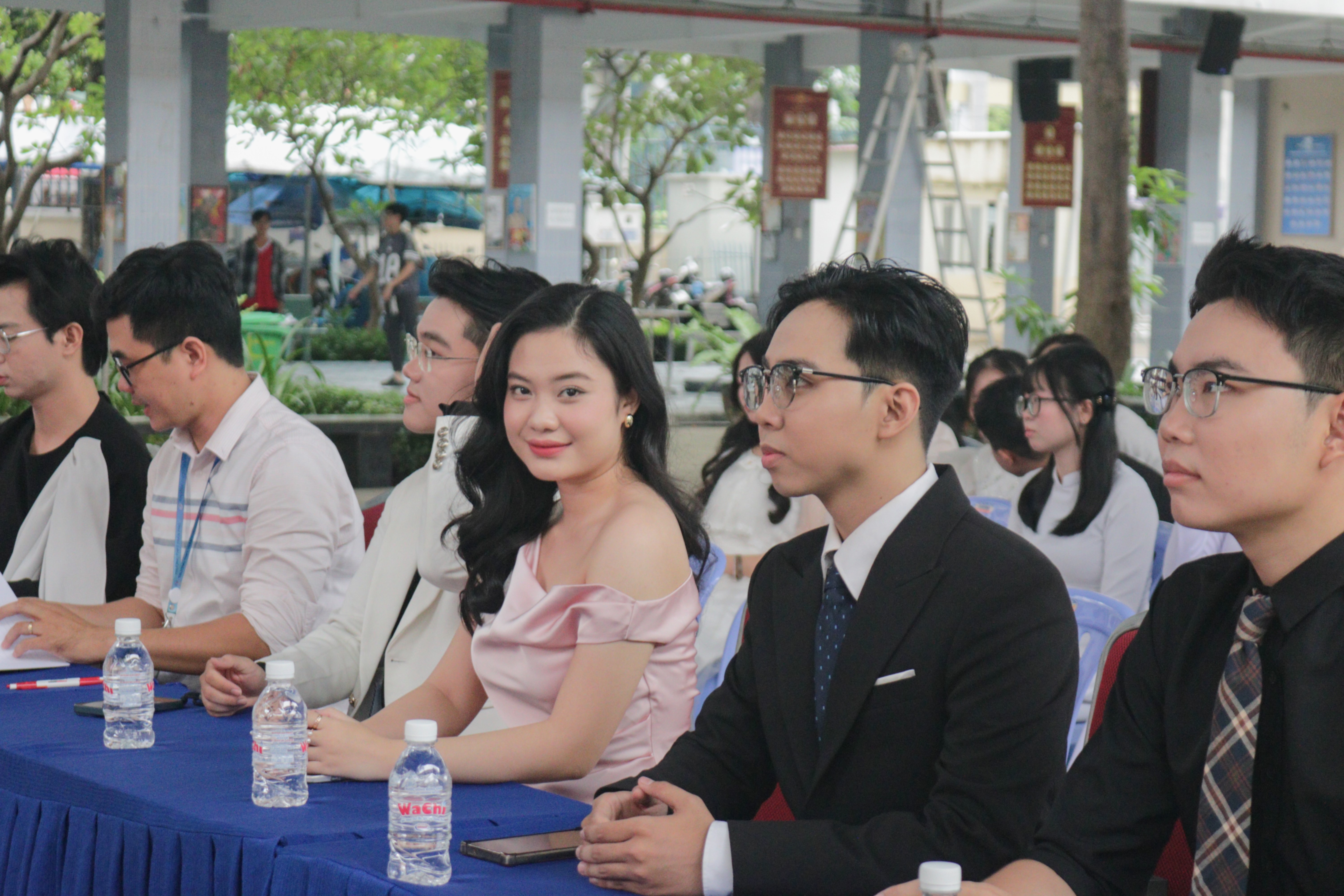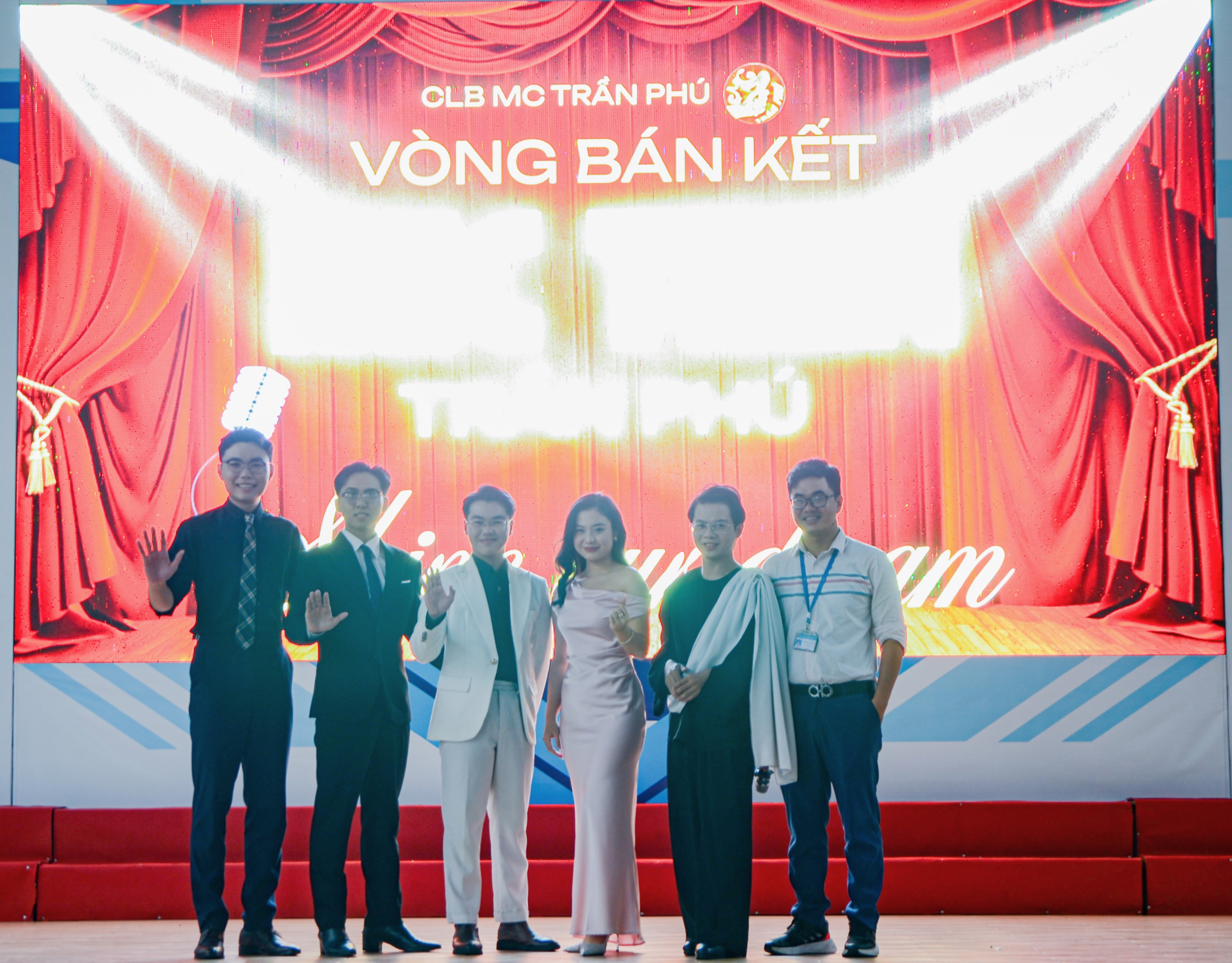 Lần lượt từ trái qua: MC Thiên Đăng, MC Tiến Phước, MC Đình Phúc, MC Vân Anh, Host-MC Thanh Thái, và Trưởng BTC Thầy Thanh Tuấn